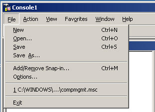 3) A Management window will appear, click 'File->Add/Remove Snap-in'.