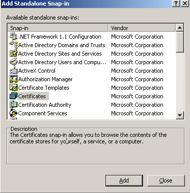 4) The Add/Remove Snap-In window will appear, click 'Add' and select 'Certificates', then click 'Add'.