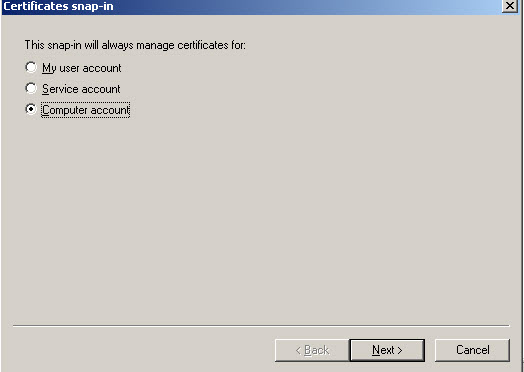 5) Select 'Computer Account' on the Certificates Snap-in screen, and click Next.