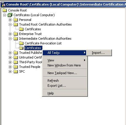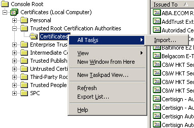 16) Right click Certficates, and Select 'All Tasks->Import'