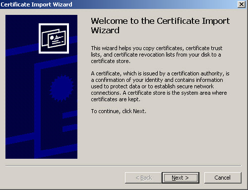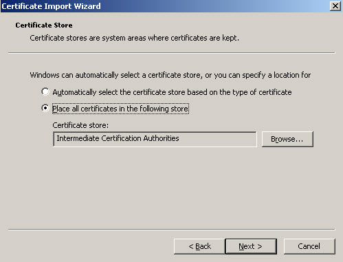 18) Click Next, then select 'Place all certficates into the following store' 'Intermediate Certification Authorities', click Next Again.