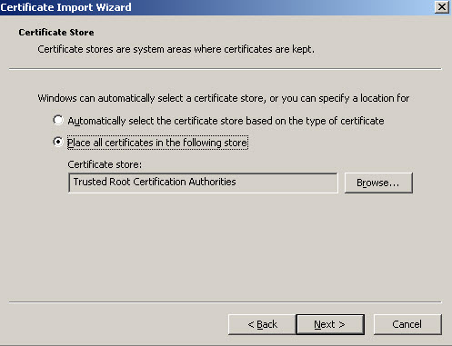 13) Select 'Place all certificates in the following store' - 'Trusted Root Certification Authorities', click Next, then click Finish.