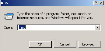 2) From the Server Machine, click 'Start->Run' (may vary on your OS), type 'mmc' into the Open Box, click OK